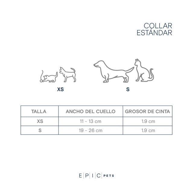 Ofrecemos nuestro collar estándar con broche de alta calidad en tallas pequeñas (XS y S) para gatos y perros chicos.
